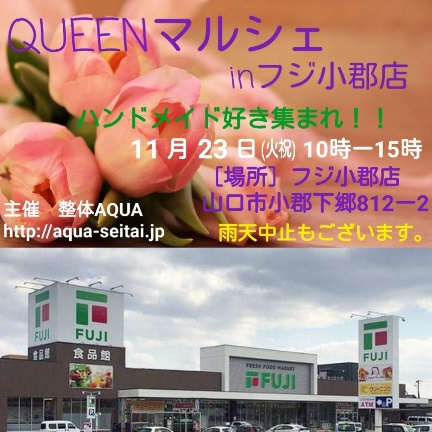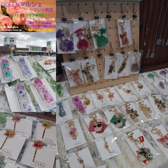11/23(火祝)☆QUEENマルシェ☆inフジ小郡店~出展者様ご紹介『ハンドメイドたま』さん~レジンアクセサリーお楽しみ下さい!! 083-923-6667 〒753-0831 山口県山口市平井143-8 レセントα102号室 10:00〜18:00(最終受付時間)