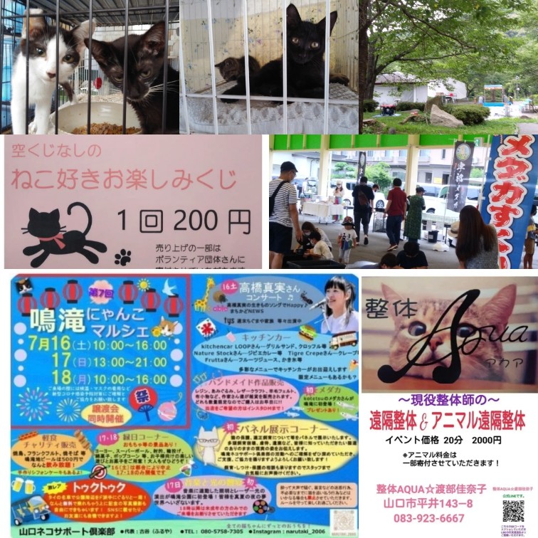 7/16(土)は『鳴滝にゃんこマルシェ』に出展します!!~遠隔整体&アニマル遠隔整体編~山口市整体アクア 083-923-6667 〒753-0831 山口県山口市平井143-8 レセントα102号室 10:00〜18:00(最終受付時間)
