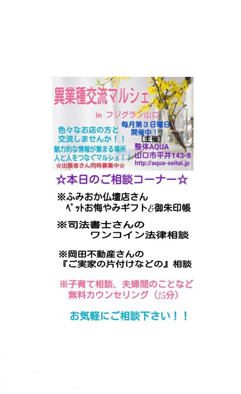 8/21(日)本日開催!!☆異業種交流マルシェ☆inフジグラン山口~ハンドメイド販売&企業ブース相談 083-923-6667 〒753-0831 山口県山口市平井143-8 レセントα102号室 10:00〜18:00(最終受付時間)