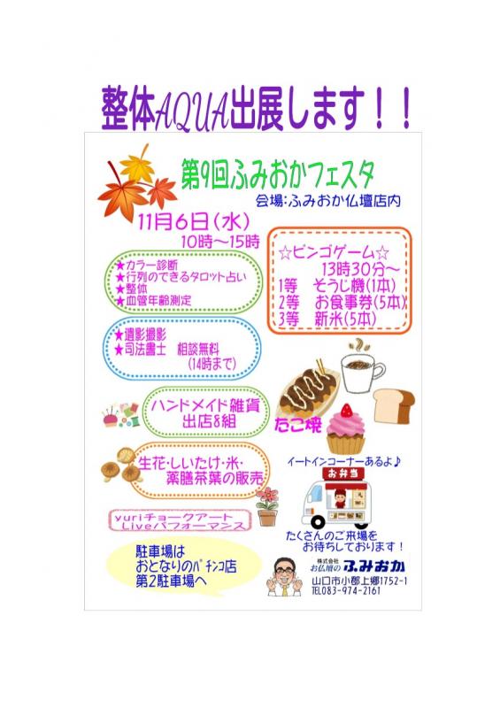 11/6(水)本日出展!!『ふみおかフェスタ』~イベント盛りだくさんですよ♪ 083-923-6667 〒753-0831 山口県山口市平井143-8 レセントα102号室 10:00〜18:00(最終受付時間)