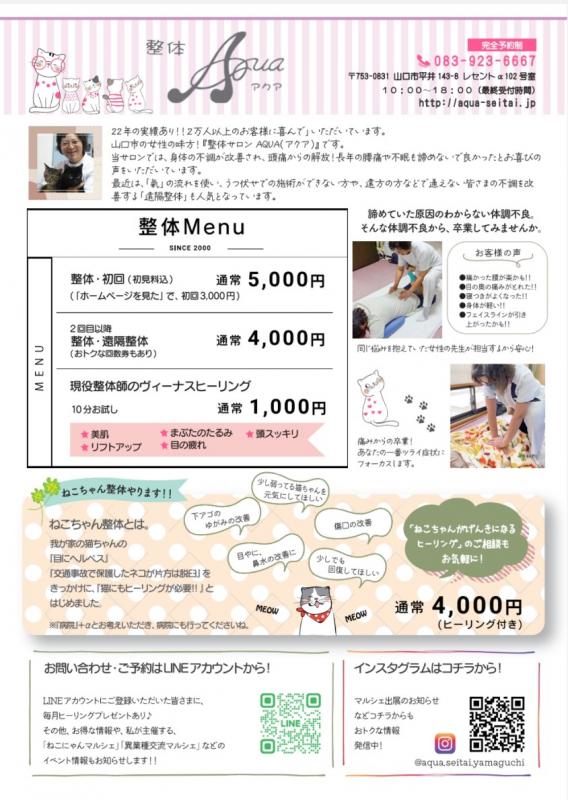 整体AQUA[年末年始のお知らせ]~年明けはR7.1/6(月)からとなります。 083-923-6667 〒753-0831 山口県山口市平井143-8 レセントα102号室 10:00〜18:00(最終受付時間)