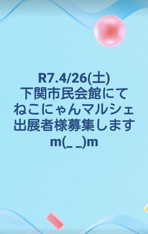 4/26(土)下関市民会館にて開催!!~出展者様募集~ねこにゃんマルシェin下関 083-923-6667 〒753-0831 山口県山口市平井143-8 レセントα102号室 10:00〜18:00(最終受付時間)