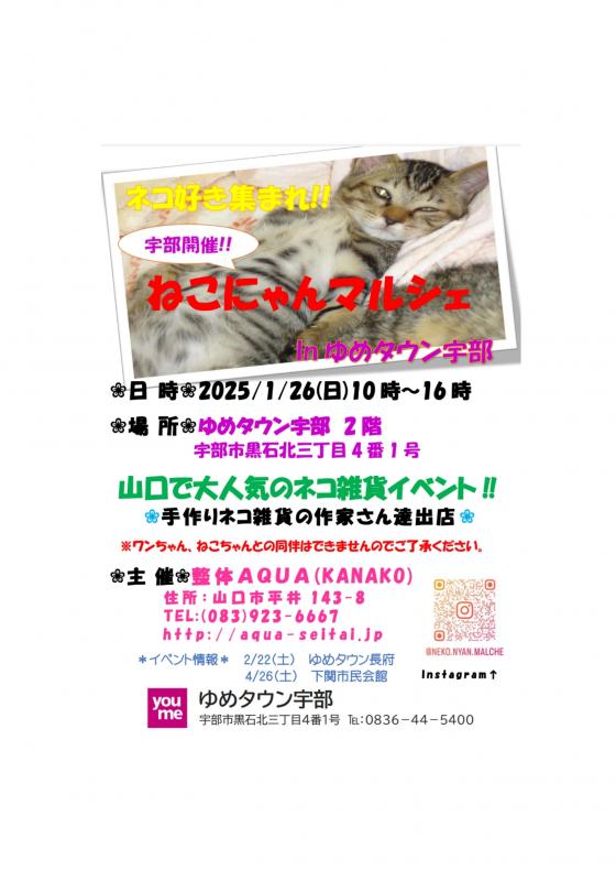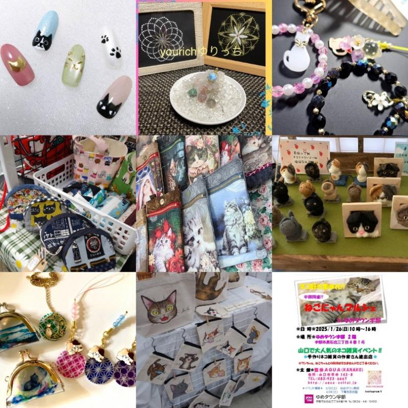新年1/26(日)『ゆめタウン宇部』からスタートします♪~ねこにゃんマルシェ 083-923-6667 〒753-0831 山口県山口市平井143-8 レセントα102号室 10:00〜18:00(最終受付時間)