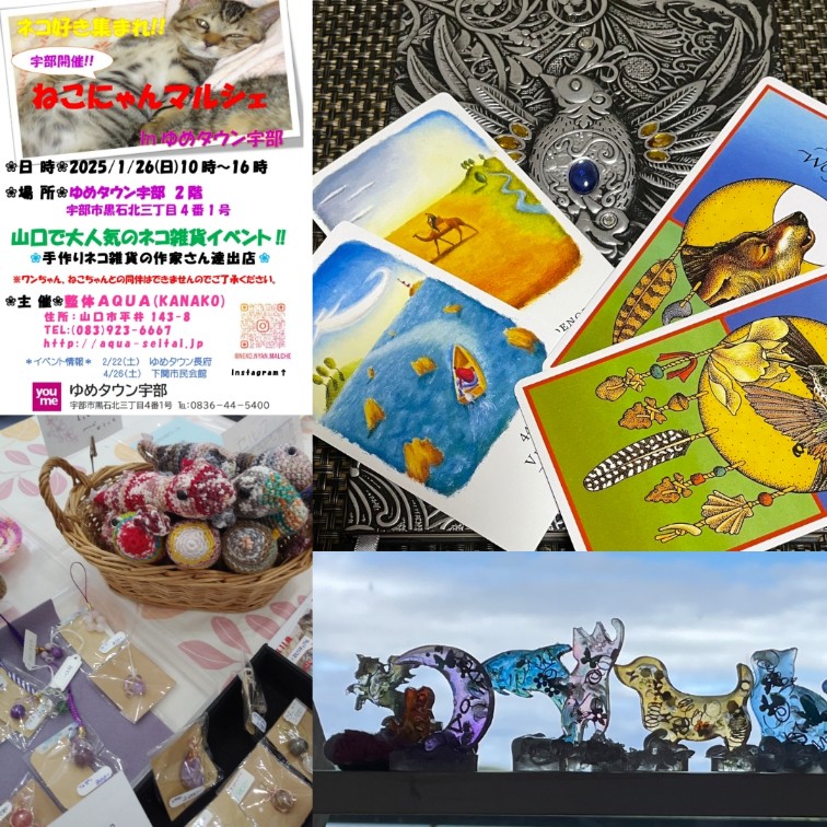 1/26(日)『ゆめタウン宇部』にて開催!!~ねこにゃんマルシェinゆめタウン宇部~占いブースもあり♪ 083-923-6667 〒753-0831 山口県山口市平井143-8 レセントα102号室 10:00〜18:00(最終受付時間)