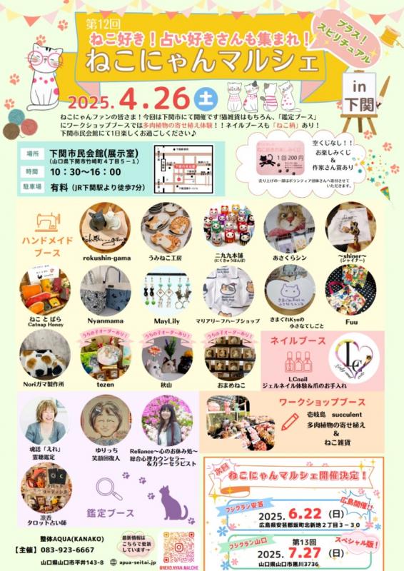 4/26(土)下関市民会館にて開催!!☆ねこにゃんマルシェin下関☆出展者様ご紹介~鑑定ブースもあり♪ 083-923-6667 〒753-0831 山口県山口市平井143-8 レセントα102号室 10:00〜18:00(最終受付時間)