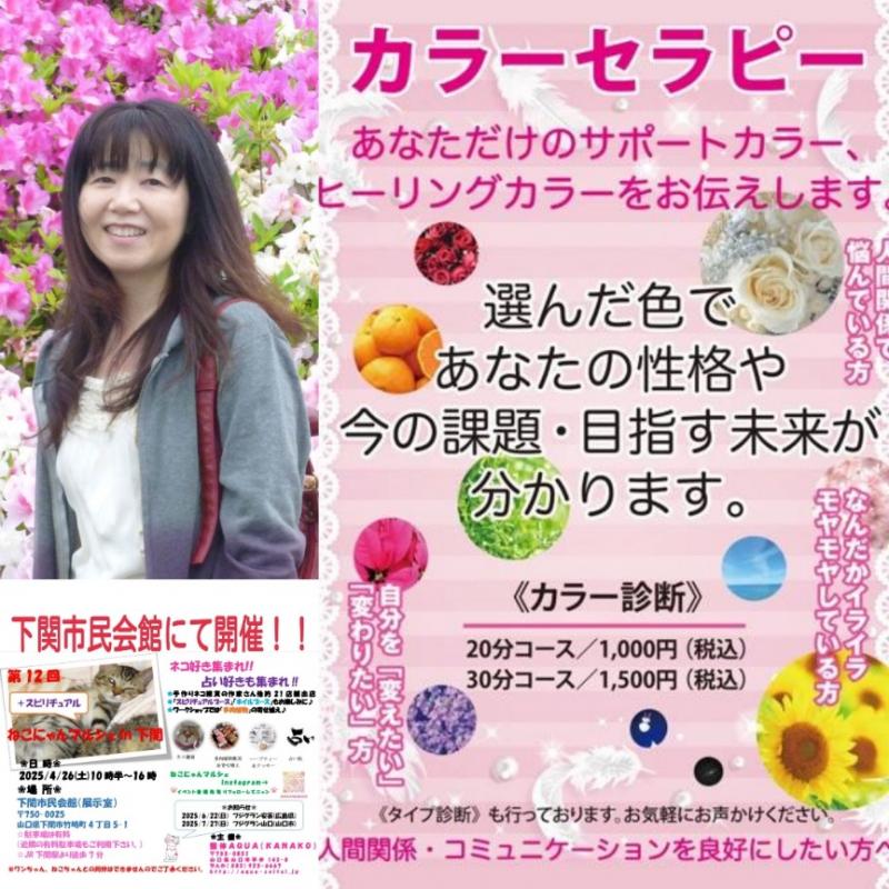 4/26(土)下関市民会館にて開催!!☆ねこにゃんマルシェin下関☆出展者様ご紹介~カラーセラピー♪ 083-923-6667 〒753-0831 山口県山口市平井143-8 レセントα102号室 10:00〜18:00(最終受付時間)