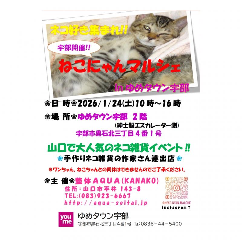 1/24(土)開催!!ねこにゃんマルシェinゆめタウン宇部〜山口市整体アクア主催 083-923-6667 〒753-0831 山口県山口市平井143-8 レセントα102号室 10:00〜18:00(最終受付時間)