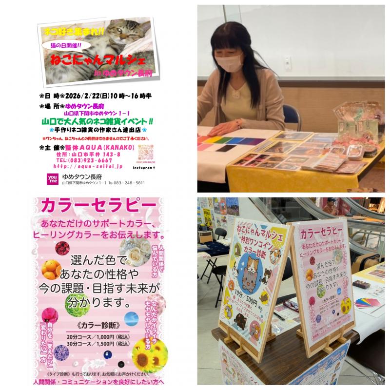 R8.2/22(日)明日開催!!ねこにゃんマルシェinゆめタウン長府〜カラーセラピーもあり♪ 083-923-6667 〒753-0831 山口県山口市平井143-8 レセントα102号室 10:00〜18:00(最終受付時間)