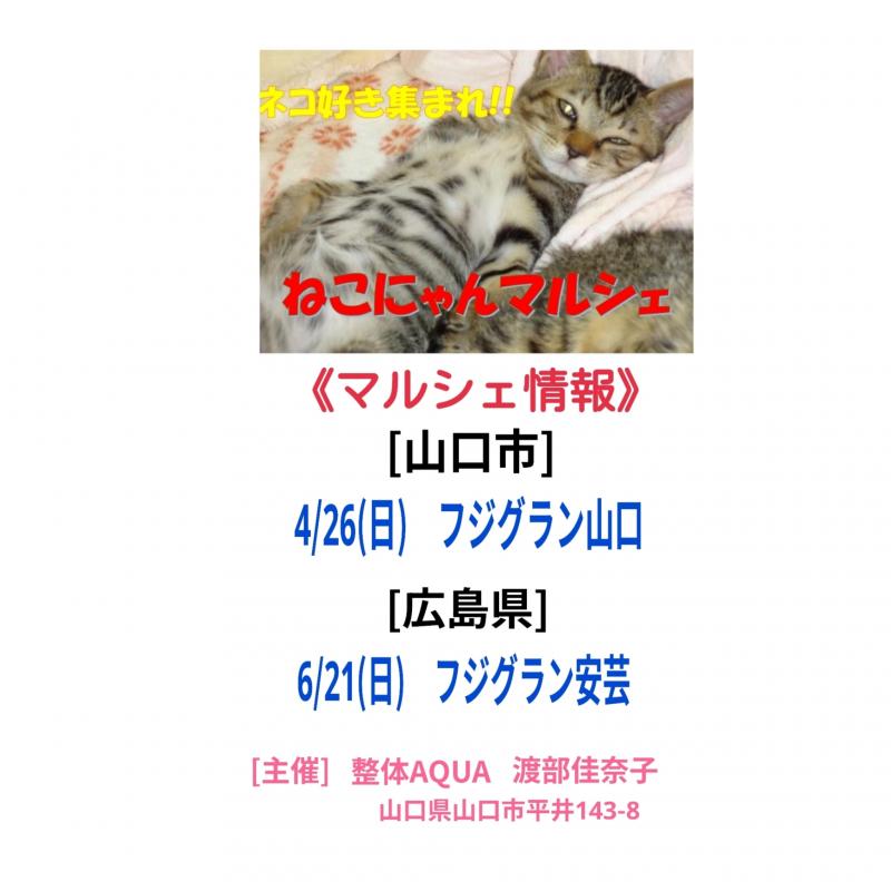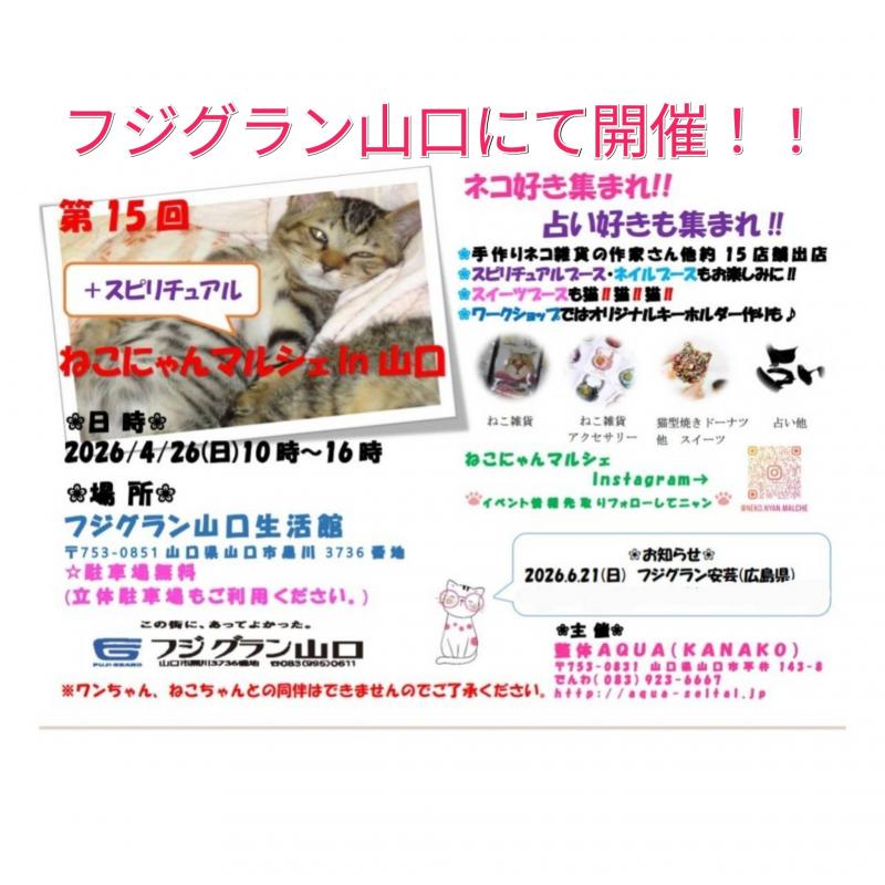 R8.4/26(日)フジグラン山口にて開催!!〜ねこにゃんマルシェin山口〜猫雑貨イベント♪ 083-923-6667 〒753-0831 山口県山口市平井143-8 レセントα102号室 10:00〜18:00(最終受付時間)