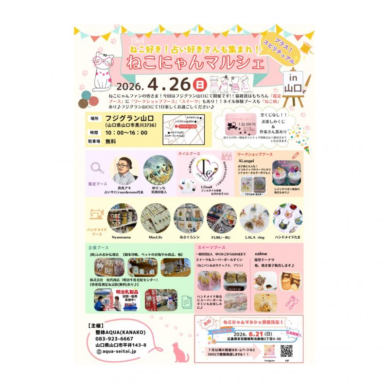 R8.4/26(日)フジグラン山口にて開催!!〜ねこにゃんマルシェin山口〜ねこ好き集まれ♪ 083-923-6667 〒753-0831 山口県山口市平井143-8 レセントα102号室 10:00〜18:00(最終受付時間)